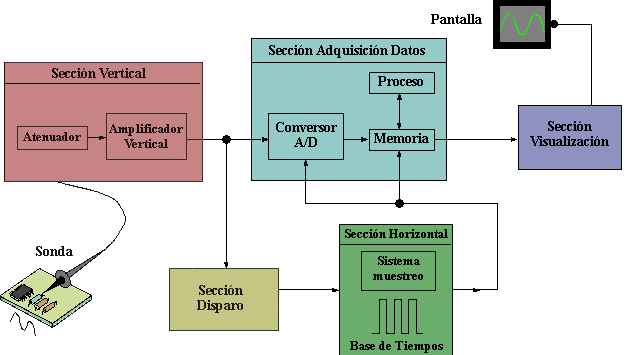 Los osciloscopios digitales poseen además de las secciones explicadas anteriormente