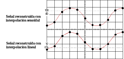 Senoidal: Conecta los puntos muestreados con curvas según un proceso matemático, de